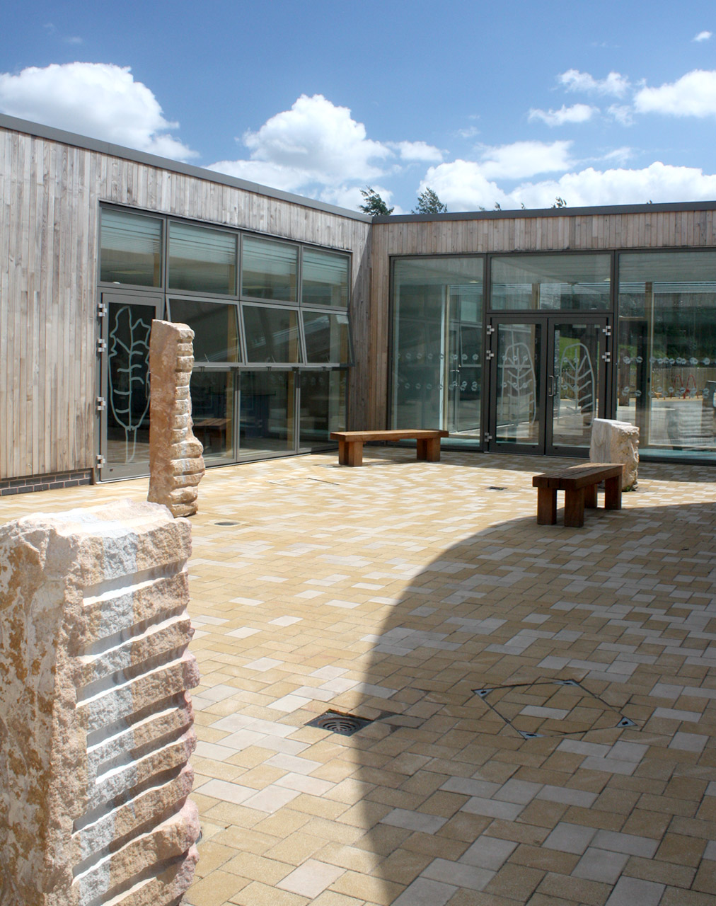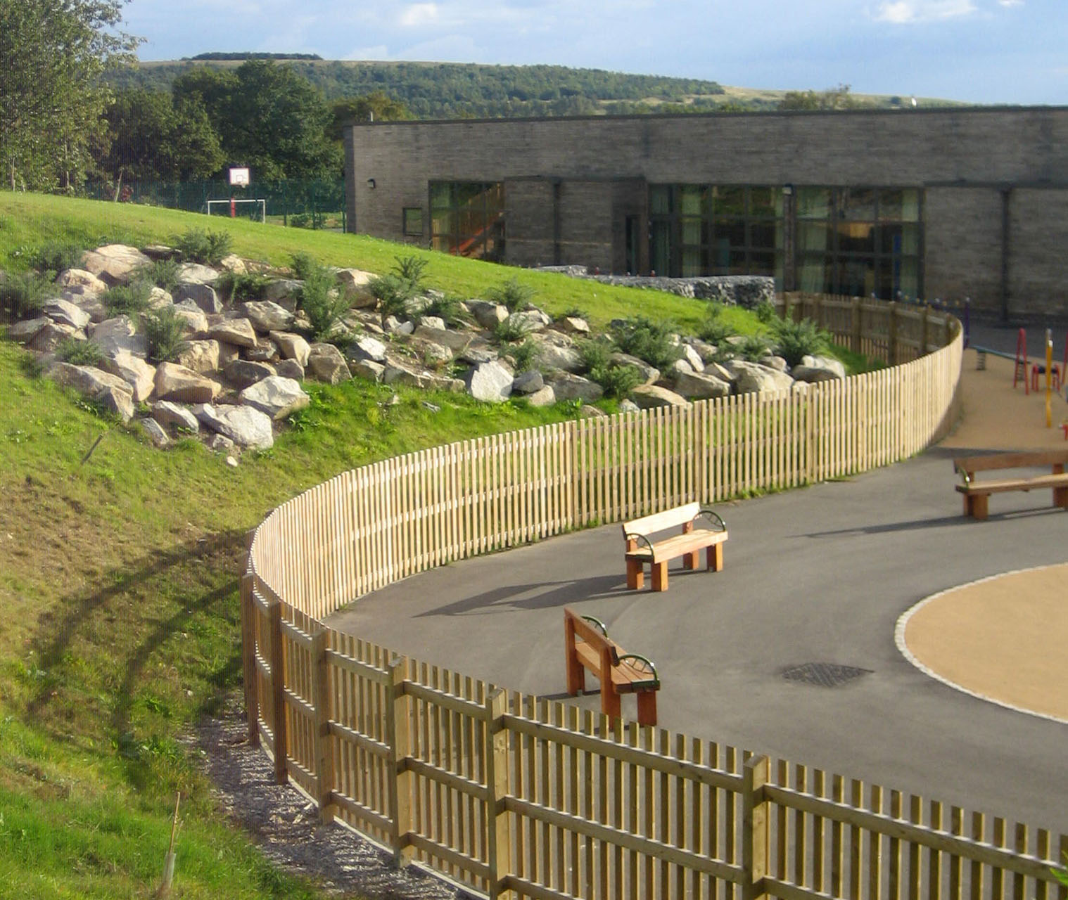 Surface water is captured then directed, at a controllable rate, into the existing SuDS swales in the school grounds. Detailed contouring was required to minimise slope angles and create useable garden spaces for the children. All of the spoil was retained and reused on site.