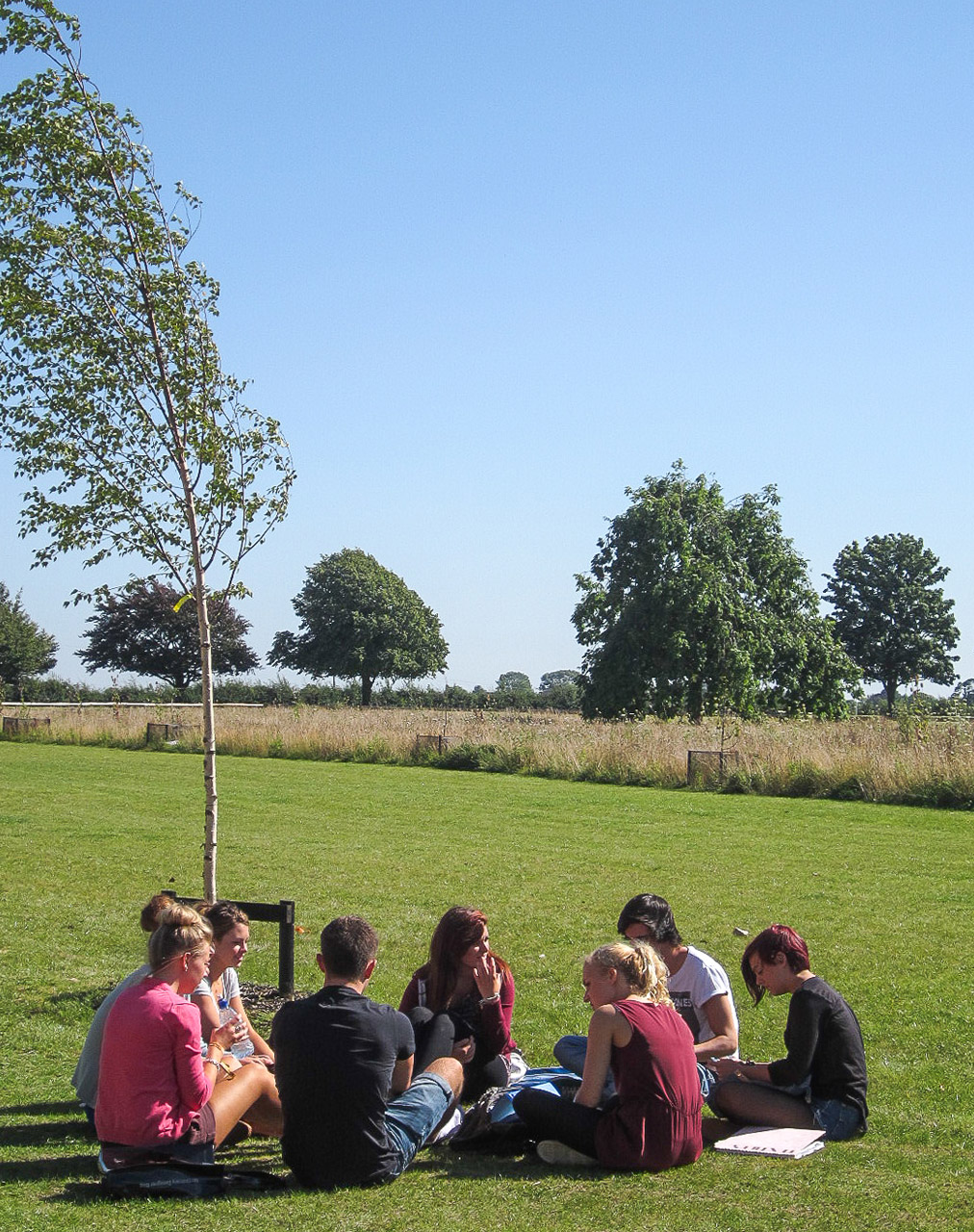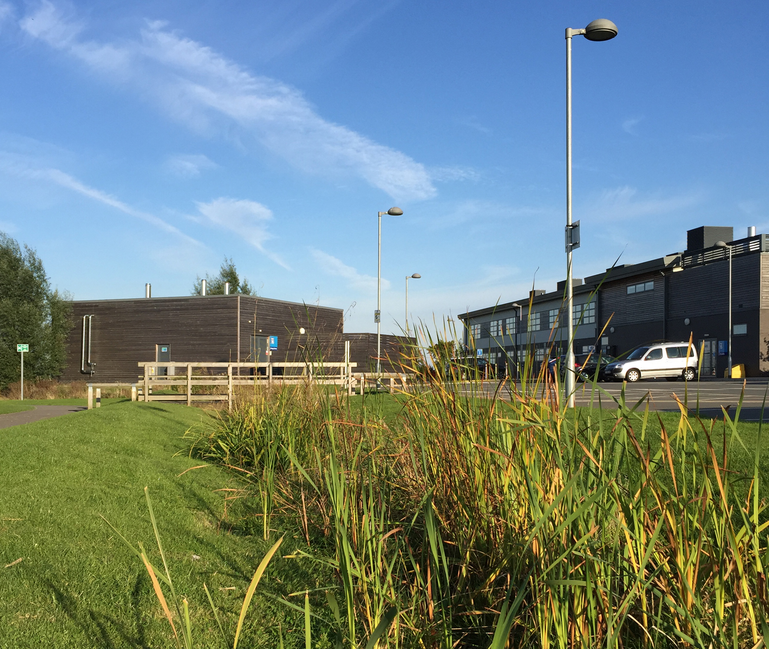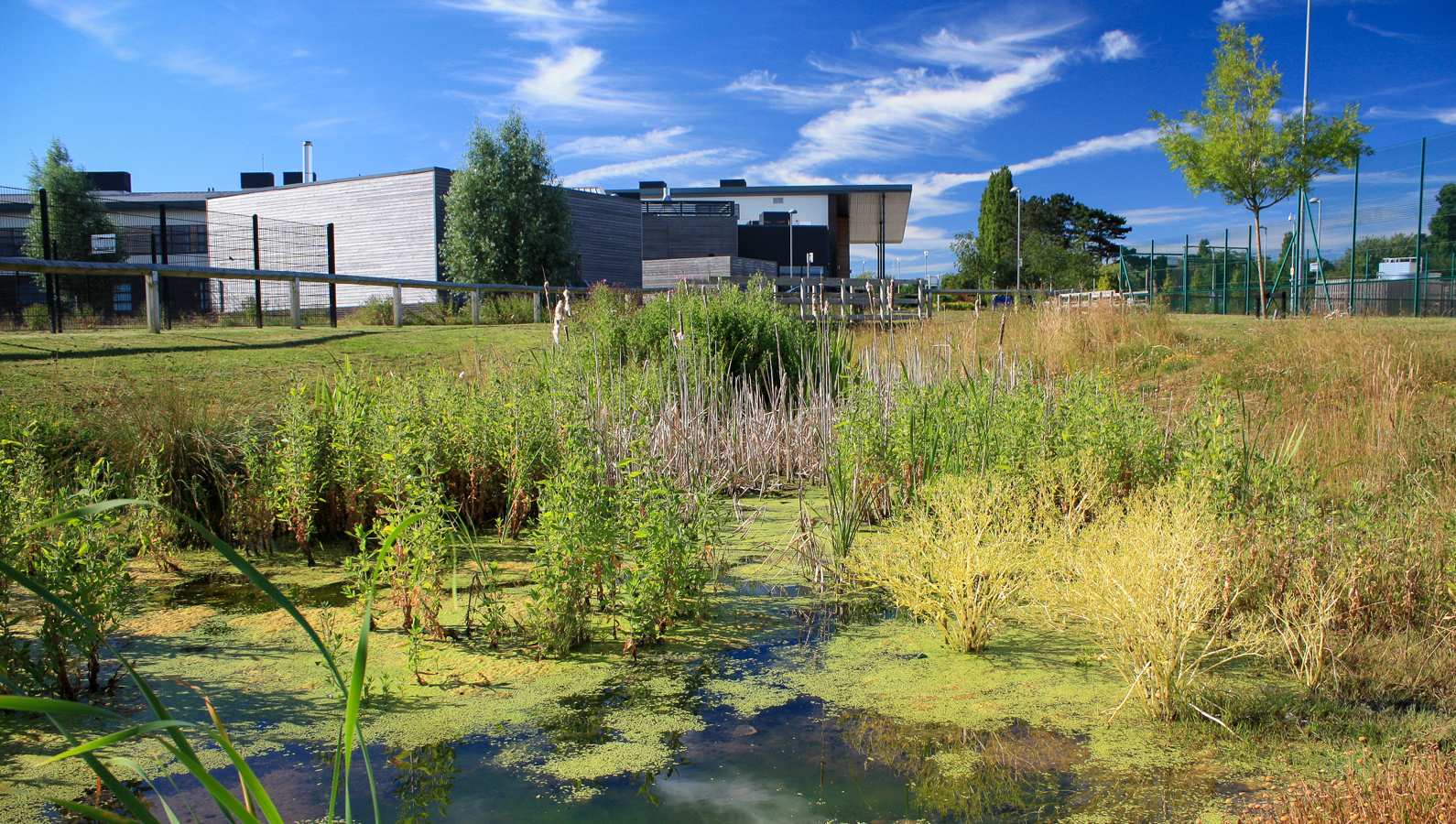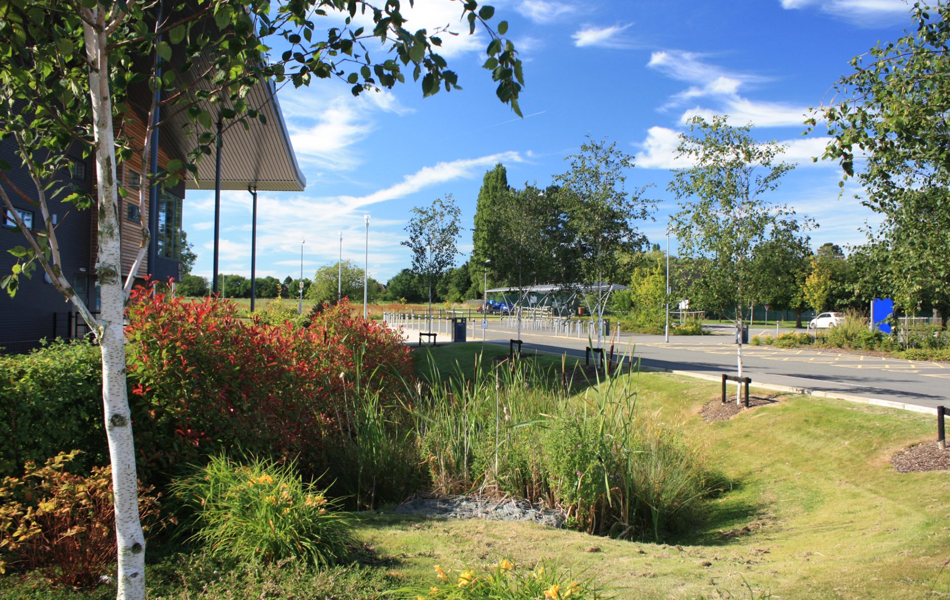 We know that there are very few British landscape projects that are visited by parties of Danish designers. This is one! DSA, A+G Architects and ARUP worked together closely on the design of the ‘water sensitive landscape’ of this new sixth form college to ensure the school grounds were easily useable for teaching. In this respect it’s a very unusual example of students learning about the environment by working in it – monitoring their evolving landscape and changing management